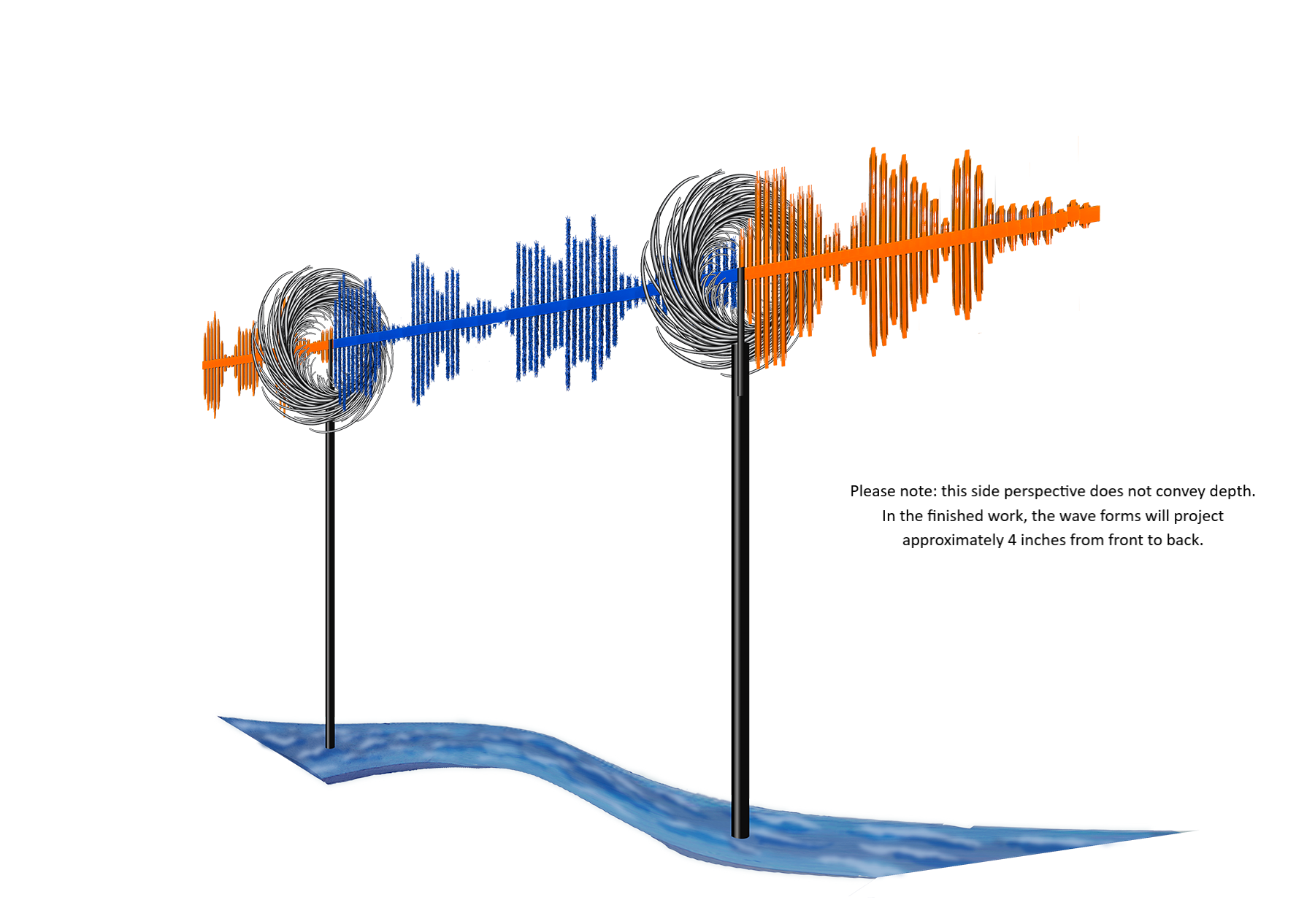 The sculpture unfolds as a horizontal sound-wave visualizer tracing the telephone’s core process – spoken voice converted into an electrical pulse and reconstructed back into sound. Orange waveforms represent the human voice, blue forms express the electrical pulse, and vortex portals act as the microphone and receiver. Derived from recordings of hello spoken in multiple languages – including Haudenosaunee, in recognition of the original peoples of the Grand River territory – the waveforms reflect both the global reach of the telephone and its local origins. Beneath the suspended waves, a blue concrete river references the Grand River, where Bell spent time immersed in nature and where his inspiration first took shape, grounding the work within Brantford’s identity as the birthplace of the telephone.