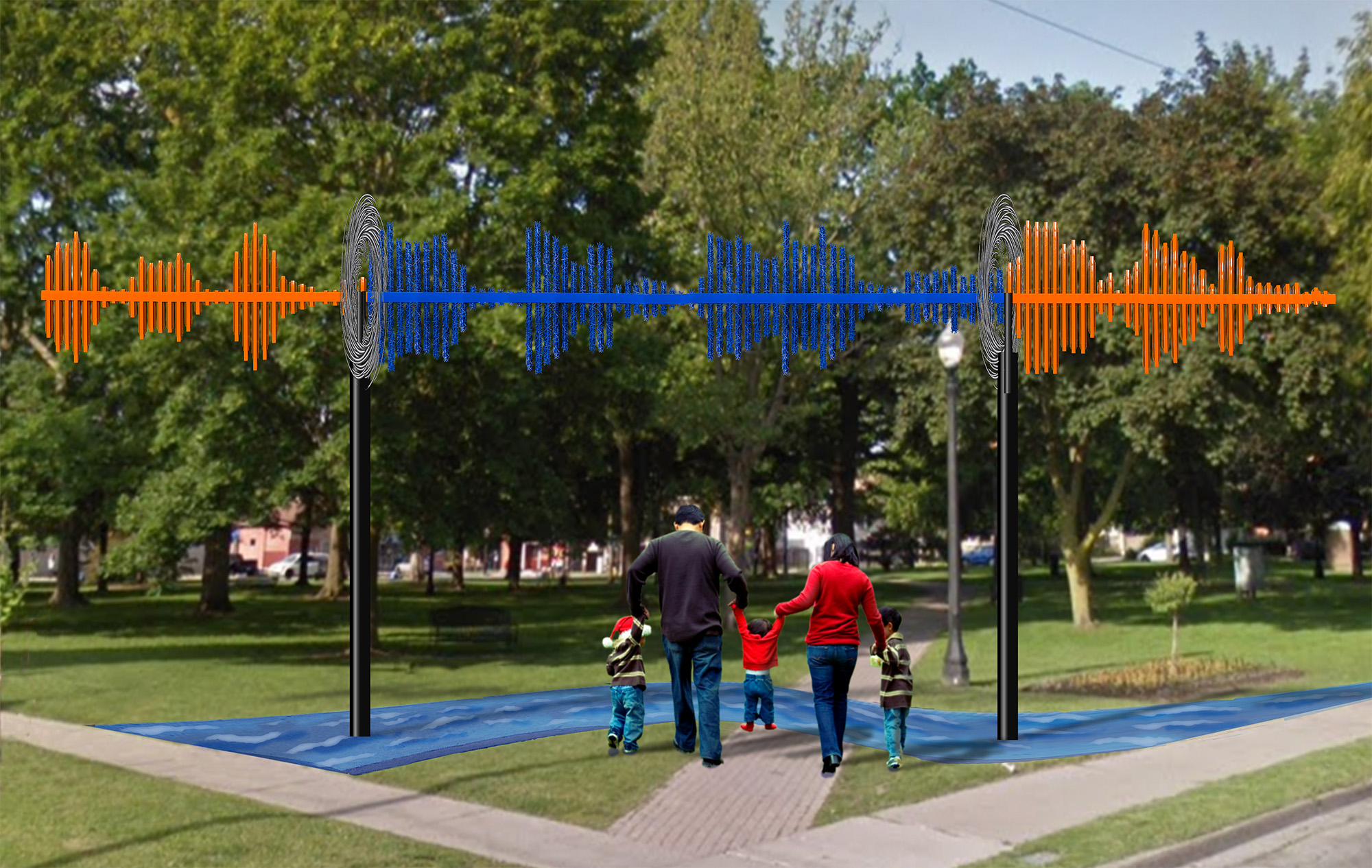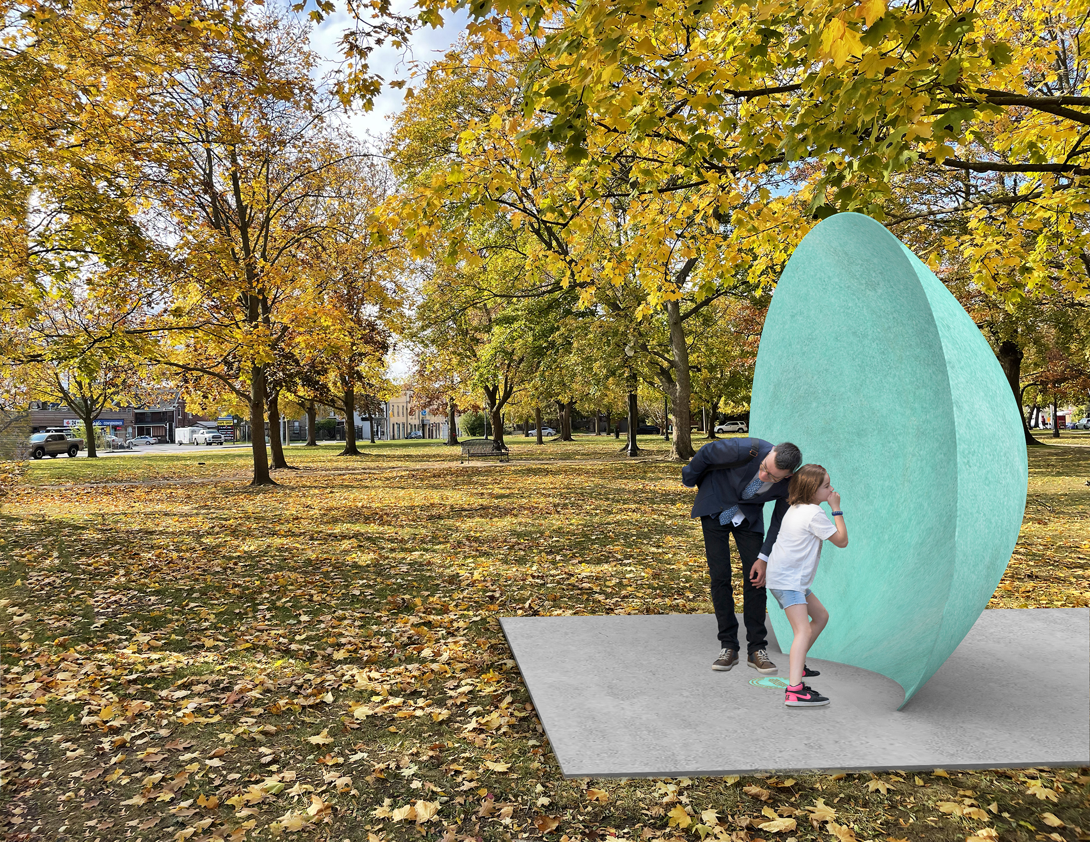 Imagine the early days of the telephone and what it was like to hear a voice clearly, from an impossible distance, for the first time – it must have felt like magic! To celebrate the 150th anniversary of the invention of the telephone in Brantford, we want people to experience something approaching the wonder of those early phone calls. We are inspired by Alexander Graham Bell’s legacy of experimentation and testing, and believe that to honour this, the public artwork needs to not only depict and celebrate but also to directly engage its audience. AHOY-HOY is composed of two monumental bronze discs facing each other across Alexandra Park. Using the discs, people can whisper to each other 50 meters away to communicate and experience the wonder of distant speech. The discs are specially shaped parabolic reflectors that let them receive sound waves over large distances. Plaques at each sculpture will explain the connection to Alexander Graham Bell and the invention of the telephone and prompt visitors to position themselves in front of one disc so they may communicate across the park with persons at the opposite one.